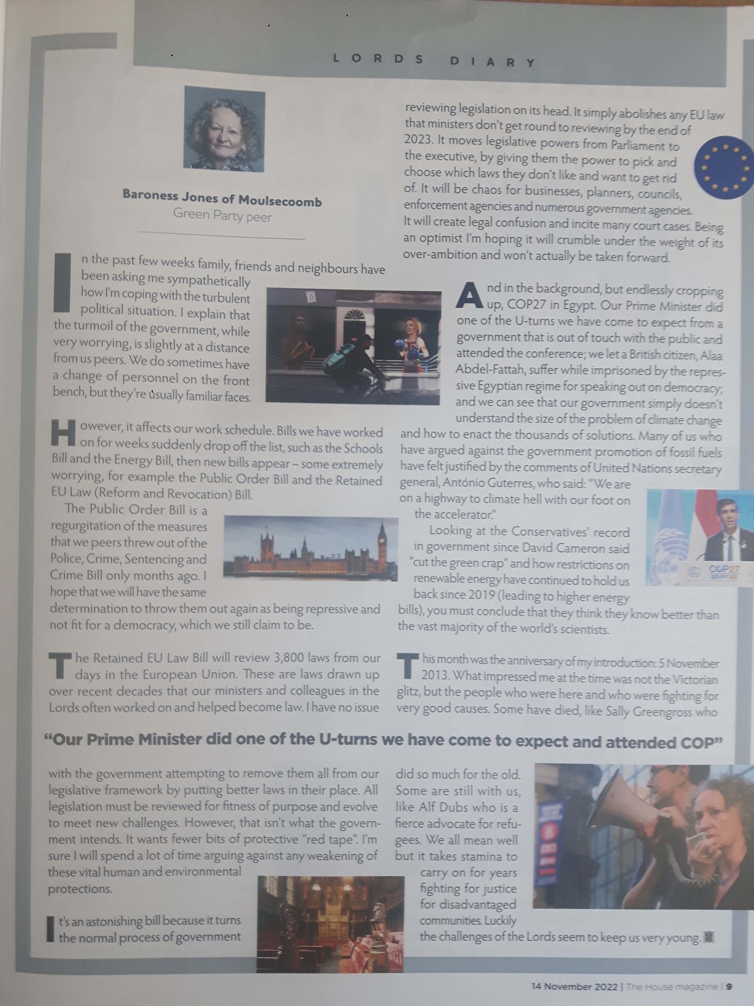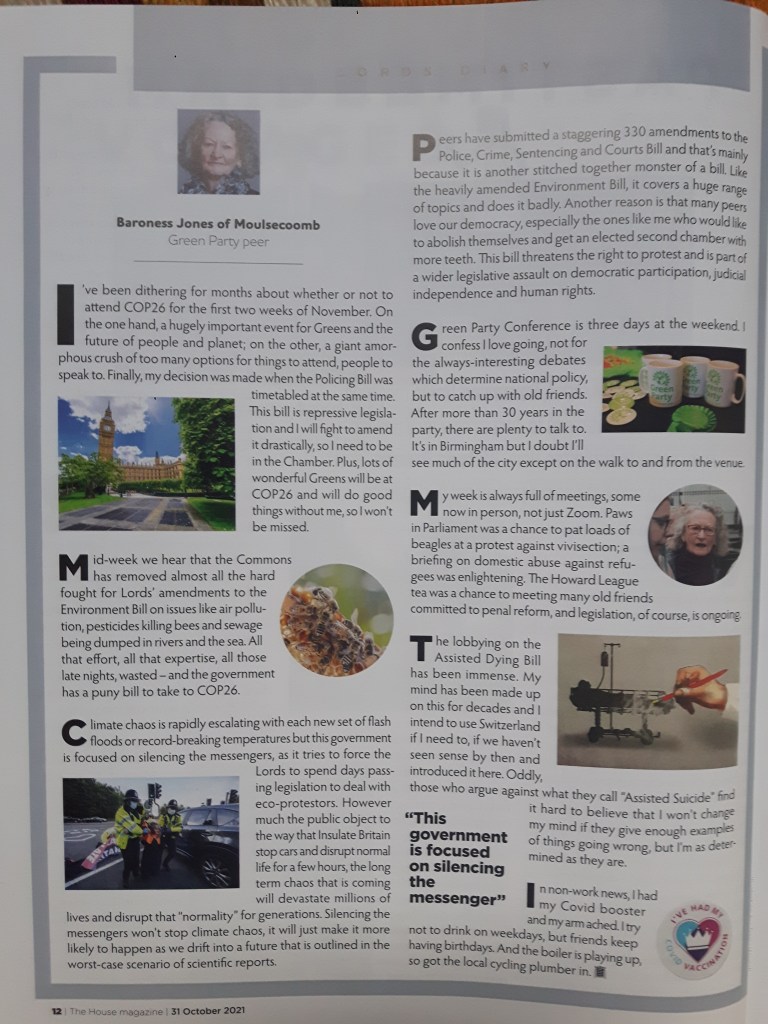 Friday In between putting out a beer trap for slugs to keep them away from our early peas, picking the last raspberries from the allotment, and chatting to neighbours, I daydream about having another Green peer (or several). With 1m votes at the last General Election, yet only one MP elected, if the Government won’t bring in Proportional Representation it could at least give us more peers.